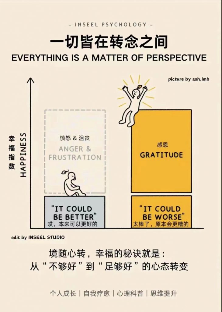 境随心转,你是更快乐,还是更负面,从来都在你的一念之间。有时候,更加快乐的状态,仅仅是完成“不够好”到“足够好”的心态转变。你,从来都是你情绪的主人。